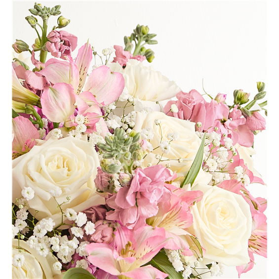 All-around arrangement with white roses and carnations, pink Peruvian lilies (alstroemeria) and stock; accented with baby’s breath and assorted greenery