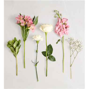 Our elegant bouquet in shades of blush pink and creamy white brings all the charm of a rustic country garden to the people you care about. Cascading blooms are hand-gathered with lush greenery inside a clear cylinder vase, creating a beautiful gift that delights with every detail.