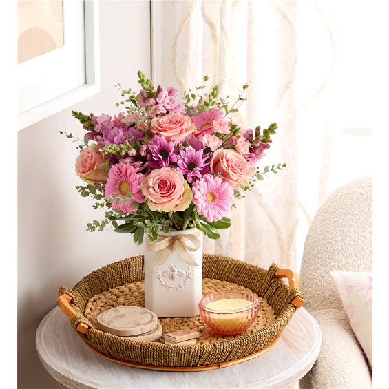 EXCLUSIVE Get them buzzing! A glorious mix of blooms in shades of pink and lavender, our eye-catching bouquet dazzles with color and texture. Designed in our Sweet As Can Bee artisanal vase, featuring an adorable honeybee, and accented with a raffia bow, it’s a gift that adds charm and beauty to any decor.